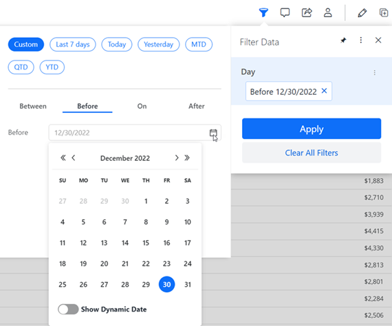 - You can create a quick dynamic date filter by selecting one of the other options, such as Last 7 Days, Today, or MTD. For steps, see Filter a Chapter by Creating a Quick Dynamic Date.