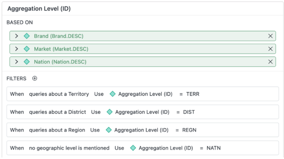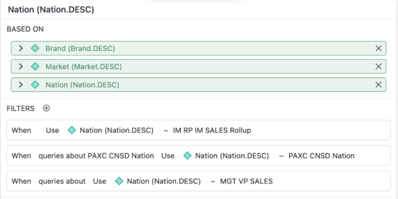 Set a default filter that changes only if the user explicitly specifies something different. In the example below, queries about nation use the IM RP IM Sales Rollup filter. If the PAXC CNSD nation is used in the query, that nation is used as the filter.