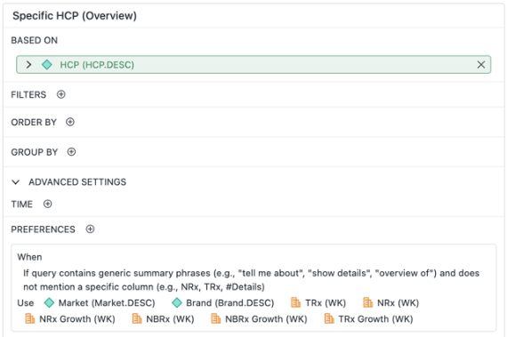 Beginning in Strategy One (January 2026), you can specify that a specific column displays but group by a different column. In the example below, if a query contains the text "Top HCPs", the response is grouped by description and then ID.