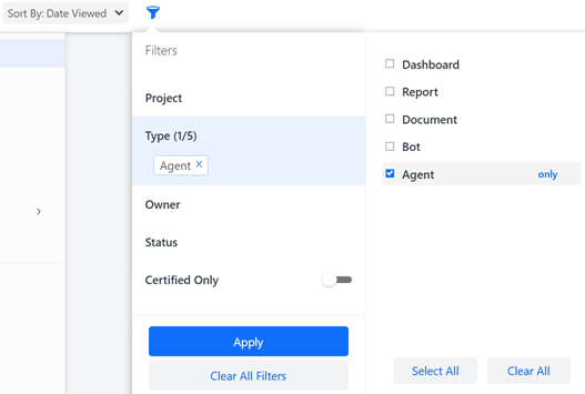 - In Library, click a agent to open it. You can use the Filters panel to search for a specific agent name or filter to display only agents, as shown below: