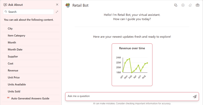 In a agent, you interact with the data that the agent designerincluded. However, if you are not familiar with that data, you may find it challenging to know what to ask about, beyond the suggestions and prompts designed by the agent designer. Beginning in Strategy One (July 2025), open the Ask About panel to display the agent's content. The Ask About panel lists the available columns and their descriptions (if available). You can start a conversation about any of the columns. The agent response describes the data and, for an attribute, lists the available elements (for example, the actual names of customers). Additional details and insights are provided to help you understand the data so that you can create thoughtful analytic questions. In the example below, the user asked about the Cost metric. More examples are provided in the steps below.