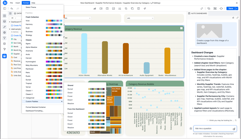Strategy One(December 2025)以降、画像の色はダッシュボード用のカスタムパレットを作成するために使用されます。以下の例では、画像から抽出されたカラーパレットが書式メニューのこのダッシュボードからに一覧表示されています。