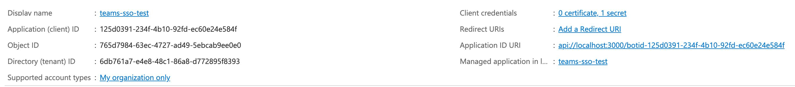 - Copy the Application (client) ID and Directory (tenant) ID values to for later use in the Teams add-in configuration page.