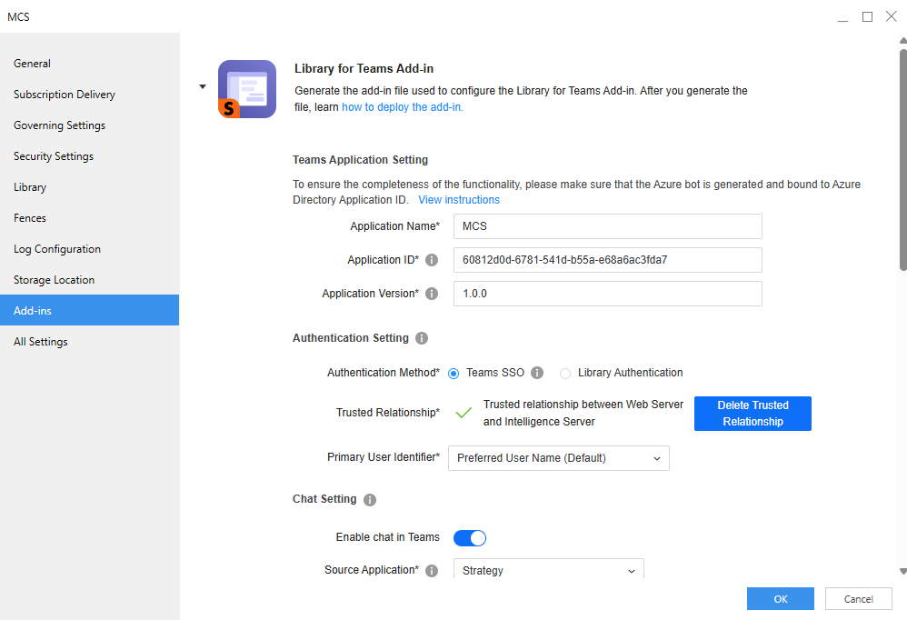 Starting in MicroStrategy ONE (September 2024), in the environment Add-ins dialog, toggle on Enable chat in Teams to use Bots in Teams and choose a Source Application.