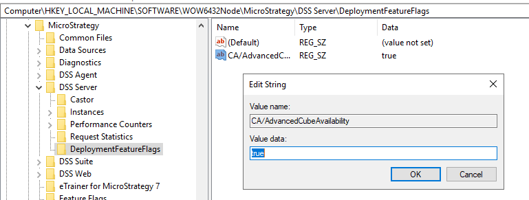 In Computer\HKEY_LOCAL_MACHINE\SOFTWARE\WOW6432Node\MicroStrategy\DSS Serverkey, add a newDeploymentFeatureFlagskey, if it does not already exist.