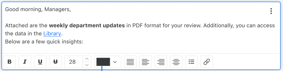 Strategy Oneから開始 (2025年6月)、ビジュアライゼーション、画像やロゴ、リッチ テキスト、属性やメトリックからデータを取得する動的テキストを追加して、メール本文を強化できます。さらに、エンド ユーザーには、今後のメール配信の購読を解除するオプションがあります。