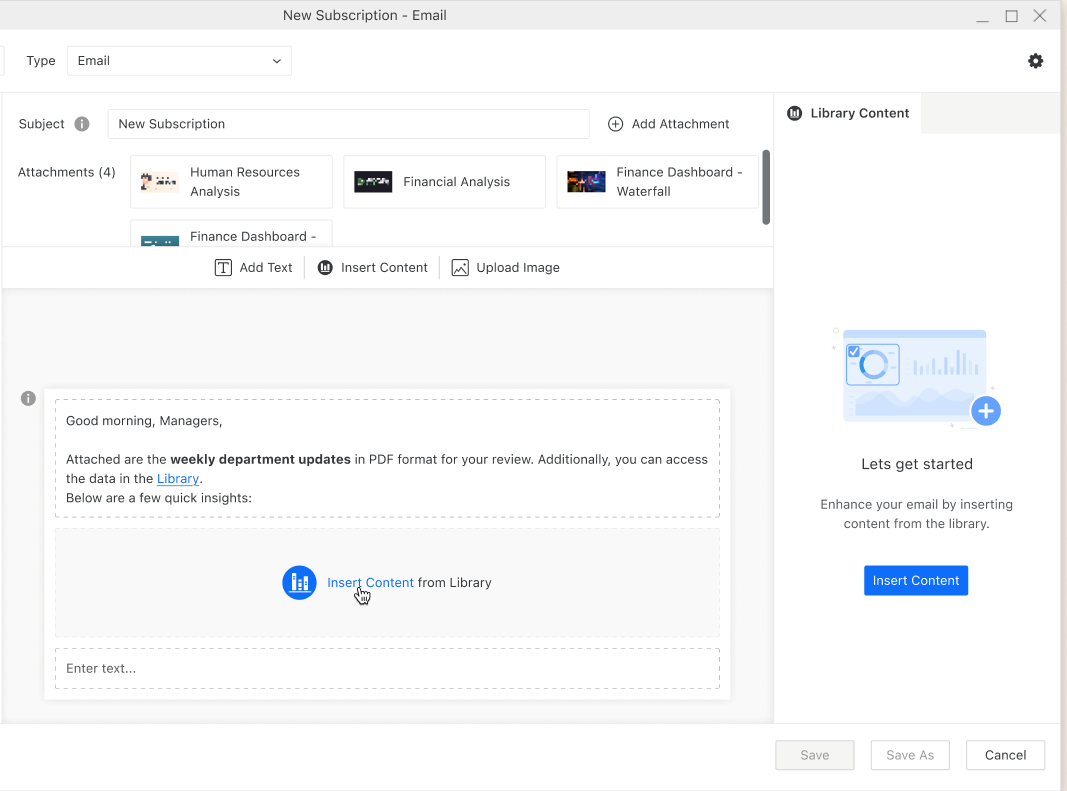MicroStrategy ONE (2024 年 12 月) 以降、メールの件名と本文テキストに動的テキストを追加できます (アトリビュートとメトリックのデータを使用)。購読に追加されたコンテンツのファイル名 (メール件名や本文テキストと同様、動的なテキストを含む) を編集することもできます。