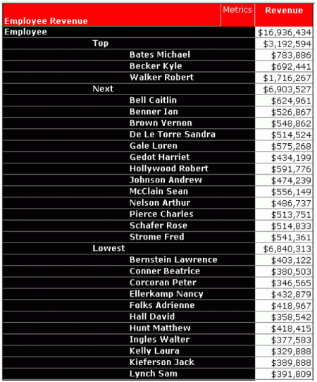 You want to create a report that ranks employees according to the revenue that each employee generates. Based on their revenue, the report should segregate the employees into the following three groups: Top for the top 10%, Next for the next 40%, and Lowest for the lowest 50%.