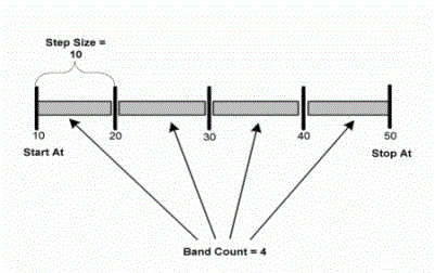 In the following diagram the "start at" value is 10, "stop at" is 50, and "step size" is 10. These settings slice the group into four bands.