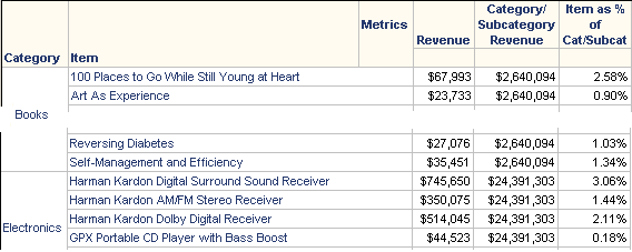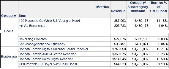 When the prompt is answered with Category, as shown above, the report looks like the following. The Category/Subcategory Revenue amount is the same for each item; it changes only when the Category changes, as determined by the prompt answer. The item revenue is divided by the category revenue, to yield the percentage.