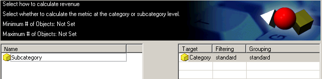 Create a report listing items with sales calculated at either the Category or the Subcategory level. The item's revenue is displayed as a percent of the Category or Subcategory revenue. At run time, the user must be able to select the Category or Subcategory level, as well as the filtering and grouping settings of the metric, as shown below: