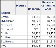 The following report sample was executed on 9/26/09. The Revenue metric returns revenue for 9/26/09, and the Revenue (2 months ago) metric calculates revenue for 7/26/09. This report allows you to compare the revenue values quickly and easily.