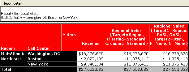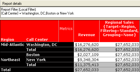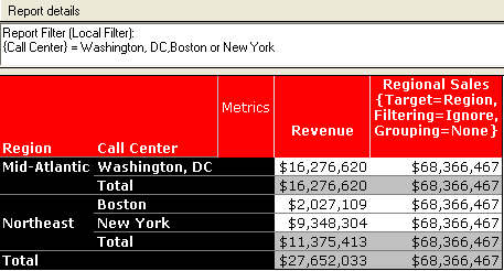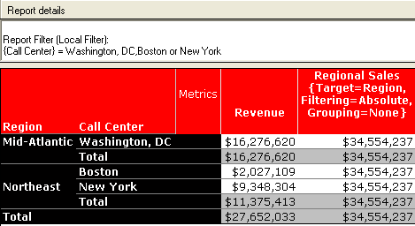 In this scenario, the Regional Sales metric calculation includes the total for all the call centers present within all the regions listed in the report, and not just the call centers included in the report filter. The metric definition is shown below: