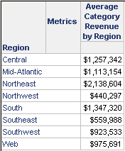 This is similar to creating a report that calculates the revenue by category for each region, and then enabling the Average subtotal, as shown below. The value of the Average subtotal is reflected in each row of the previous report: