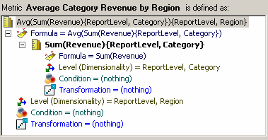 The inner formula, Sum(Revenue), calculates the revenue at the Category level. The outer formula then calculates the average of the resulting values at the Region level. In the Metric Editor, the inner formula appears as a child of the outer formula, as shown below: