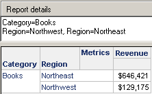 The following report sample is the same report as before, except that the Region prompt has been answered and the Category prompt has not. The prompt details for the Category prompt display the word "All," meaning that all the categories are included on the report.
