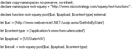 declare namespace mstr-xquery = "http://www.microstrategy.com/xquery/ rest-functions";defines whether the XQuery statement uses the REST architecture or SOAP protocol. MicroStrategy provides the following sets of functions to support querying third-party web services: - MicroStrategy REST functions: Use the URL