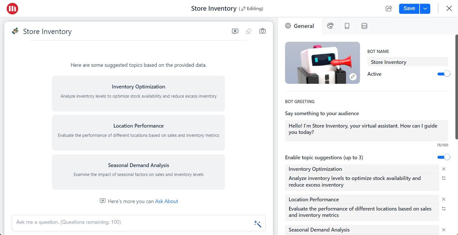 On the General tab, use Enable topic suggestions to have the bot suggest certain topics based on your dataset.