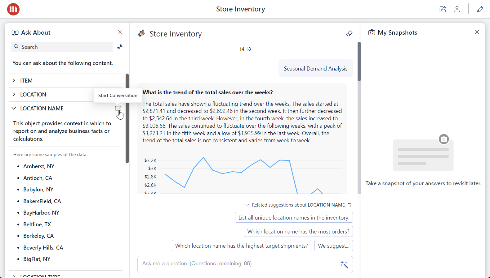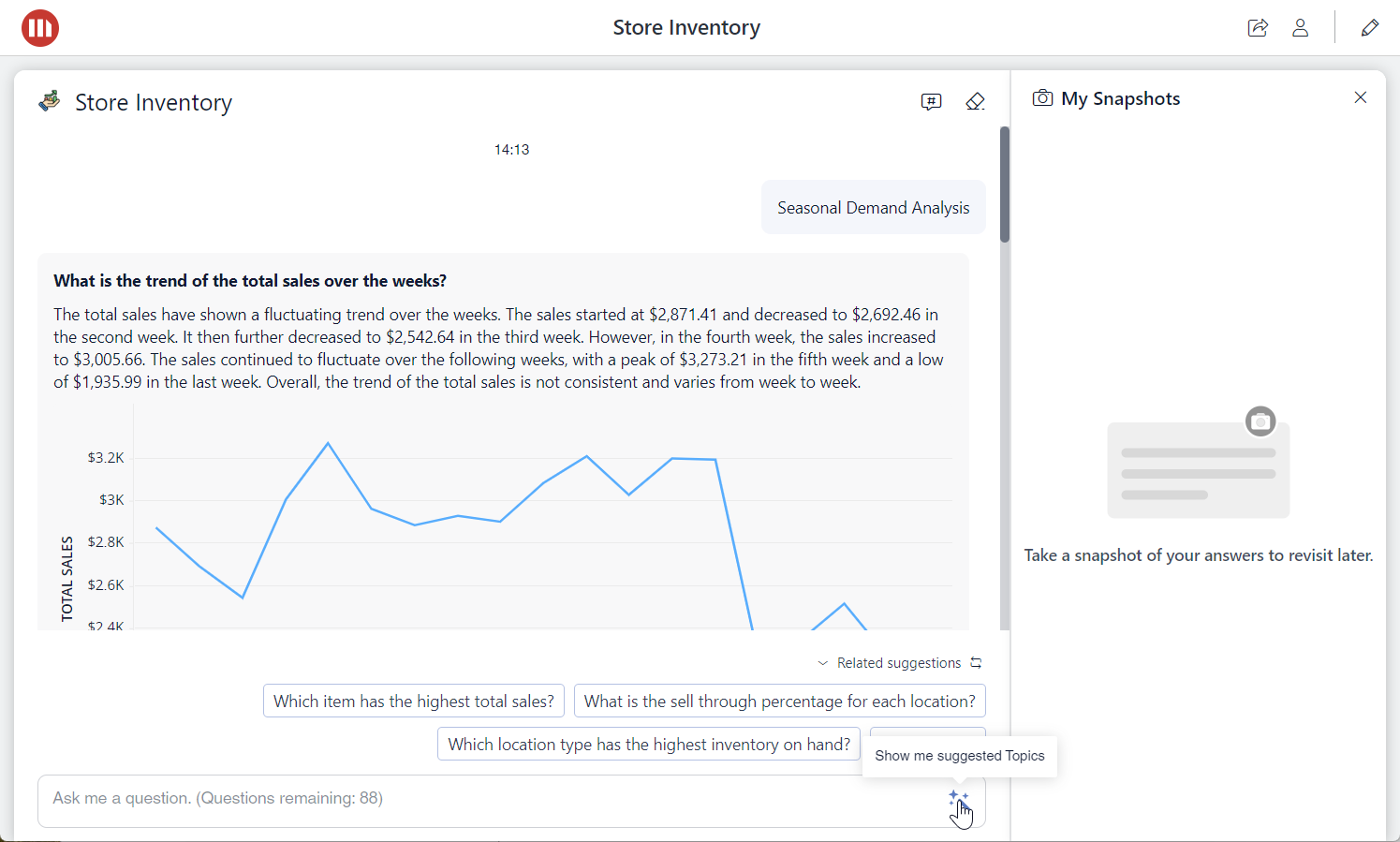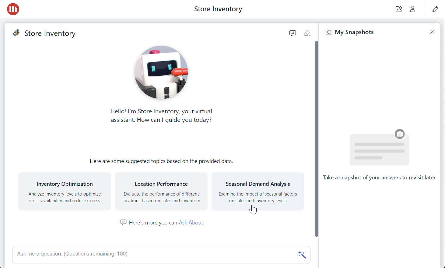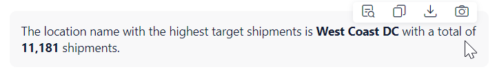 Once the Bot responds, hover over the message and click one of the icons to copy or download the message, get insights on how the Bot interpreted and executed your question, or save the message to My Snapshots.