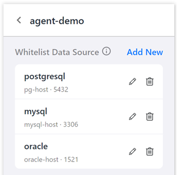Add the whitelist. The Whitelist Data Source is a set of IP/Hostname and Port configurations set by the end user to allow access to an on-premise database using the Gateway Agent client. Only the IP/Port combinations specified in the whitelist can establish a channel, thereby protecting other servers in the on-premise network.