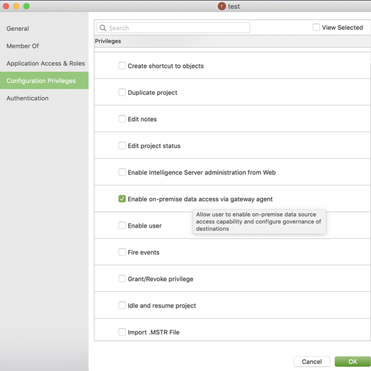 The privilege Enable on-premise data access via Gateway Agent is required to add, edit, or delete entries in the Data Source Whitelist.