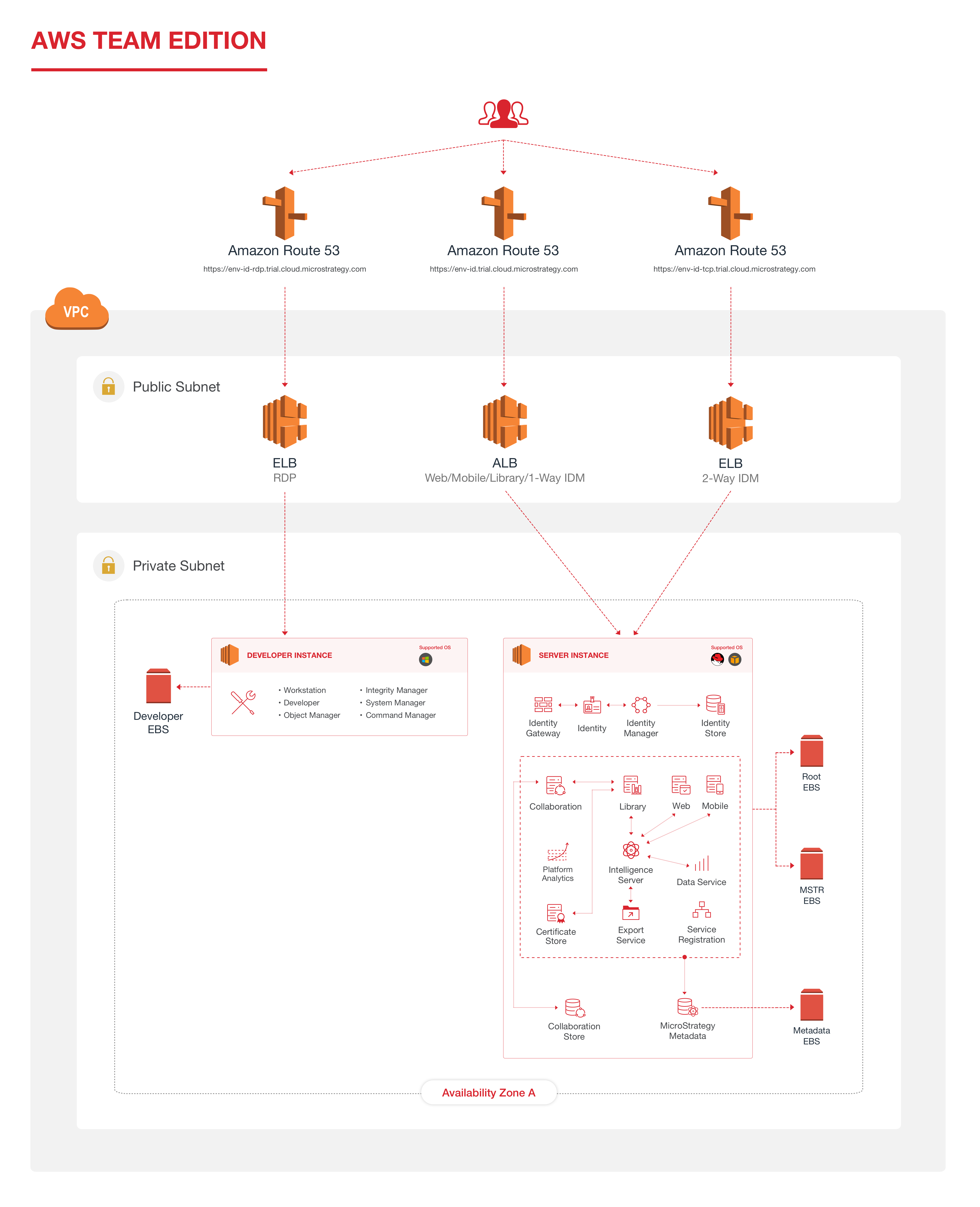 L'édition Strategy Cloud Platform for AWS Équipe offre un système tout-en-un conçu pour le partage et le développement d'applications d'équipe. Tous les serveurs ainsi que les métadonnées sont sur une instance unique. Vous avez la possibilité d'inclure une instance Developer pour la modélisation et la gestion des données afin d'augmenter la productivité.