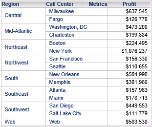 Create a grid that contains Region and Profit, as shown below. Data in the grid is displayed at the Region level. The grid contains eight rows, one for each region.