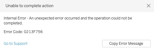 • 초기 가져오기 중에 오류가 발생하면 Tableau에서 워크시트 페이지가 열리지 않고 기본 오류가 표시됩니다. 사용자 세션 시간이 초과되어 을(를) 클릭하는 경우추출 > Tableau 새로 고침 , 고유 오류가 표시됩니다.