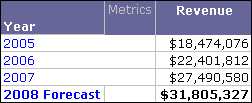 Since the ForecastV function allows you to enter a list of time intervals, it can account for time intervals that you have no data for. For example, consider the same report in a scenario in which there was no data available for the year 2006. The ForecastV function can still use the two available years to predict the revenue for 2008.