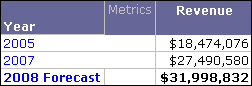 After making the new custom subtotal available for the Revenue metric (see the Advanced Reporting Guide for steps to make custom subtotals available for metrics) a report with the attribute Year and the metric Revenue is created. When the 2008 Forecast is displayed on the report, it displays the predicted value for 2008 Revenue, as shown below: