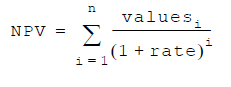 Returns the net present value of an investment based on a discount rate and a set of future payments (negative values) and income (positive values).