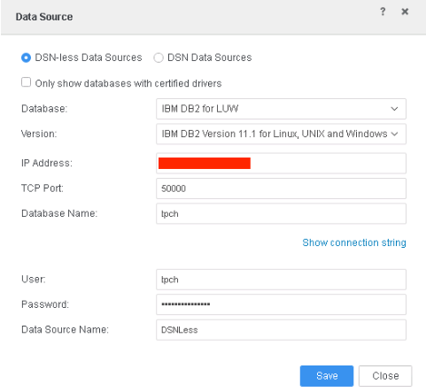 The connection string can be an ODBC string or JDBC string. The image below shows a JDBC connection.