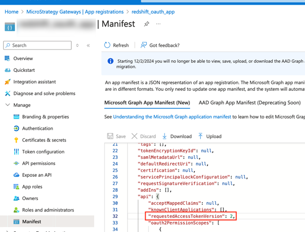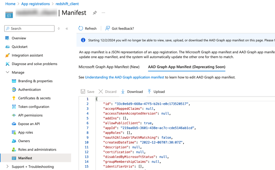 In the Microsoft Entra ID left pane, click Manifest under Manage.