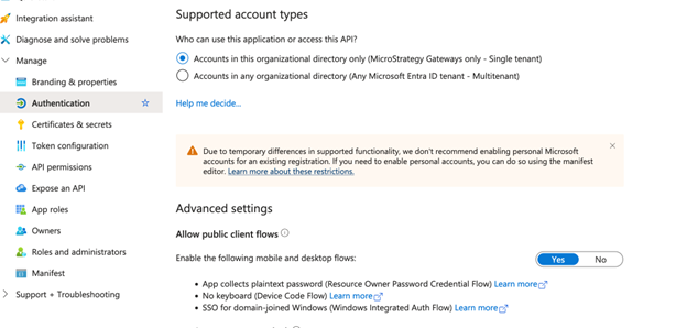 In Allow public client flows, toggle Enable the following mobile and desktop flows to Yes.