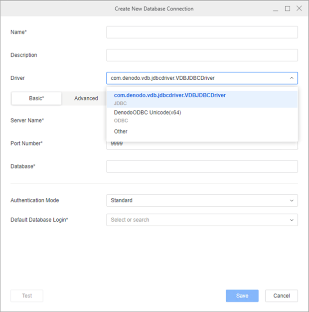 In the Driver drop-down list, choose the Denodo JDBC driver.