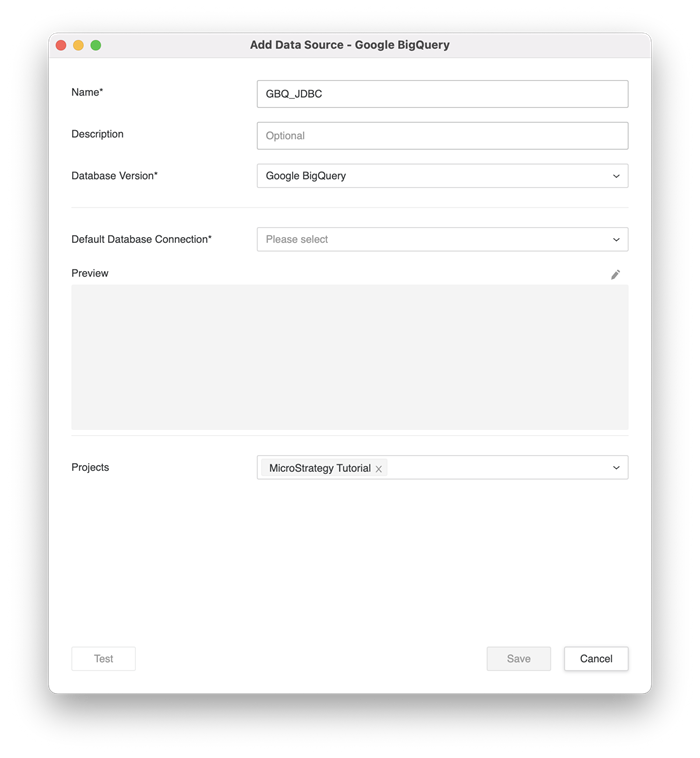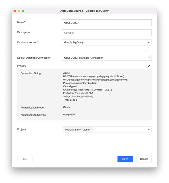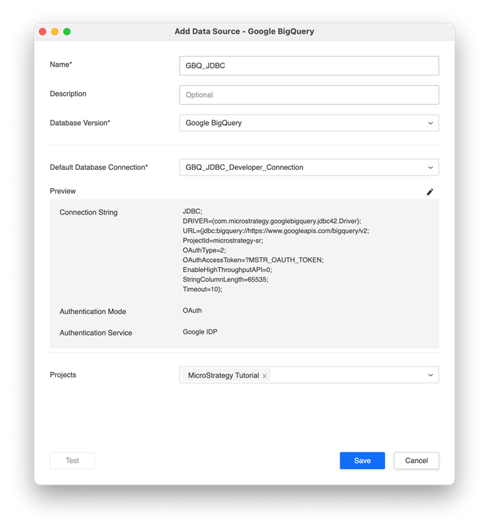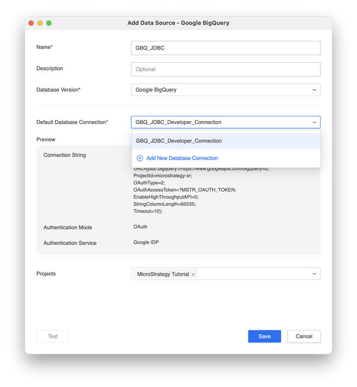 First, you create a GBQ_JDBC database instance, GBQ_JDBC_Developer_Connection and GBQ_JDBC Manager_Connection database connections. Each of these database connections use a connection string with a different billing project.