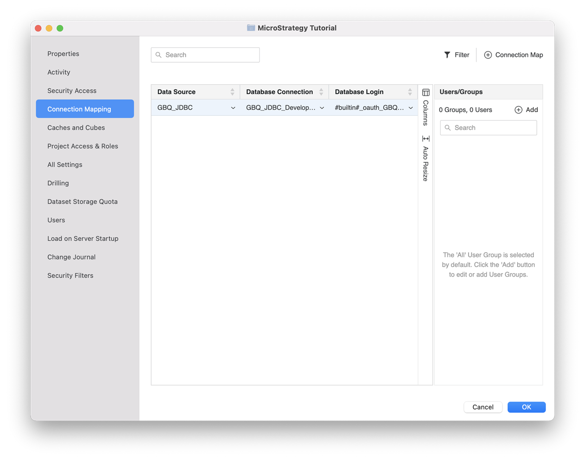 Next, use Strategy connection mapping to map the Developers group to the GBQ_JDBC_Developer_Connection and the Managers group to GBQ_JDBC Manager_Connection connections. When a Developer user logs in and queries GBQ_JDBC, the billing project set up in the GBQ_JDBC_Developer_Connection connection string is used for billing. When the Manager user logs in and queries GBQ_JDBC, the billing project set up in the Manager_Connection connection string is used for billing. This procedure uses the Google BigQuery JDBC driver, but the Google BigQuery ODBC driver can be used as well.