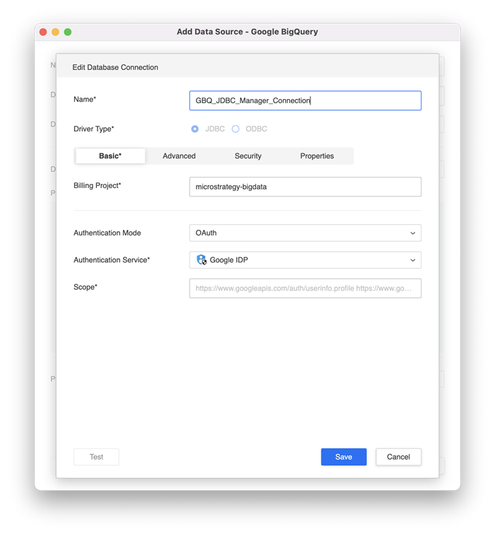 Enter the Name, select JDBC as the Driver Type, enter the Billing Project for the second group of users (Managers) and select either Token or OAuth authentication. In this example, OAuth is used as the Authentication Mode, so you must select an Authentication Service as well. The Google IdP Authentication Service in this example was created using the Enterprise Security section of the Navigation pane.