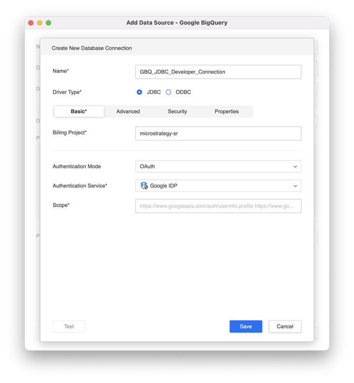 Enter the Name, select JDBC as the Driver Type, enter the Billing Project for the first group of users (Developers) and select either Token or OAuth authentication. In this example, OAuth is used as the Authentication Mode, so you must select an Authentication Service as well. The Google IdP Authentication Service in this example was created using the Enterprise Security section of the Navigation pane.