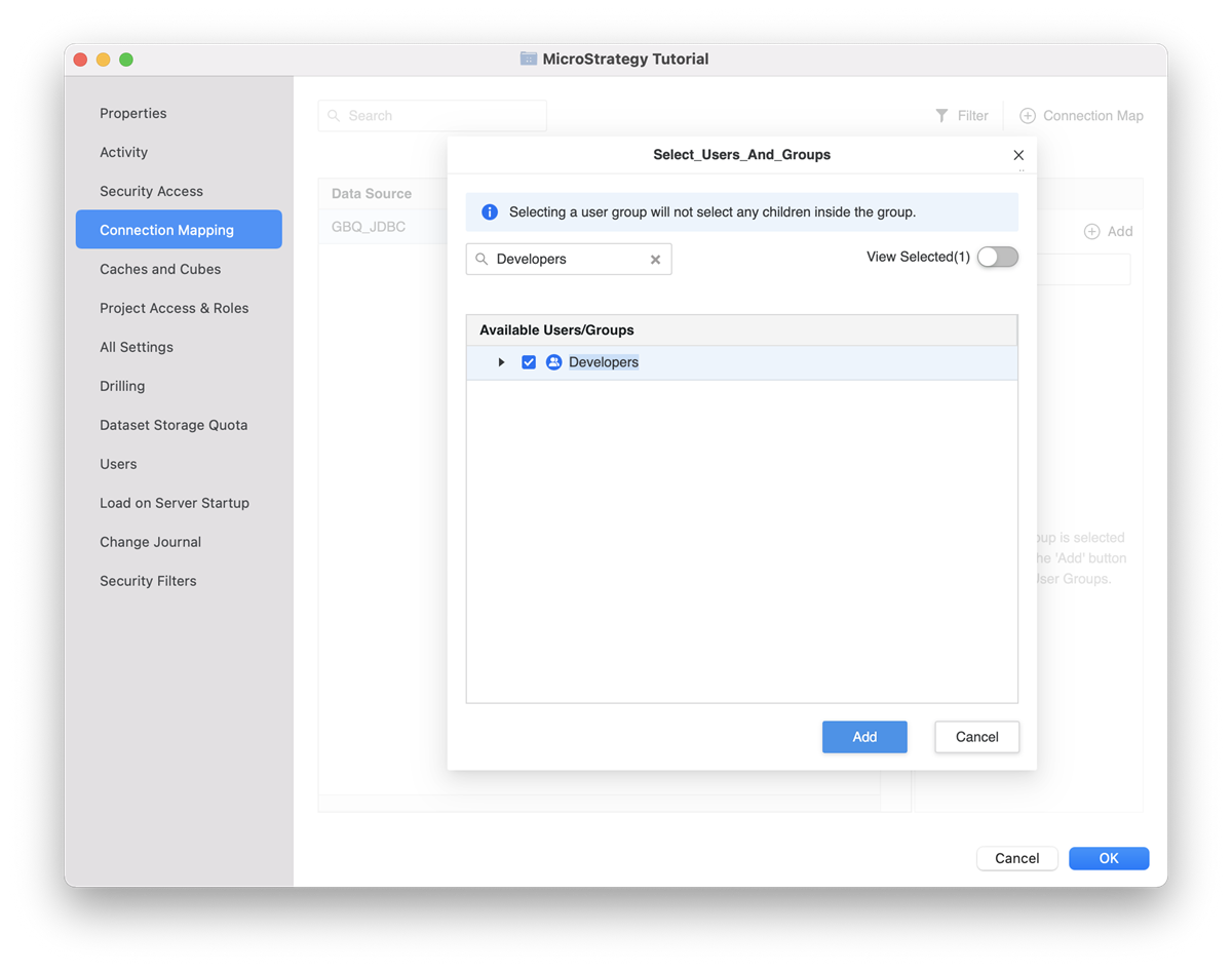 Select users and/or group of users to use for your first database connection and click Add. In this example, you want all users in the Developers group to be mapped to the first (Developer) database connection.