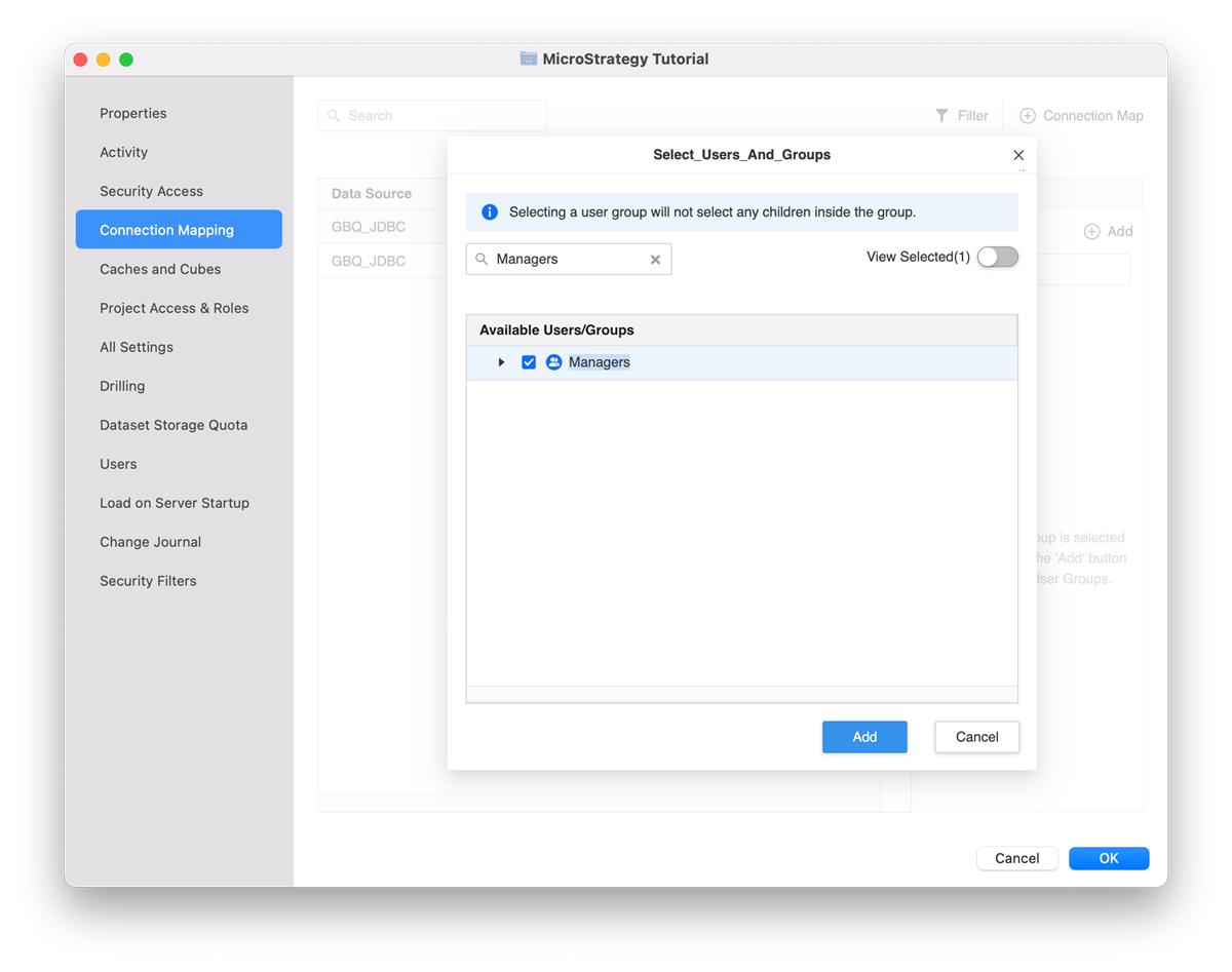 Select users and/or group of users to use for your second database connection and click Add. In this example, you want all users in the Managers group to be mapped to the second (Manager) database connection.
