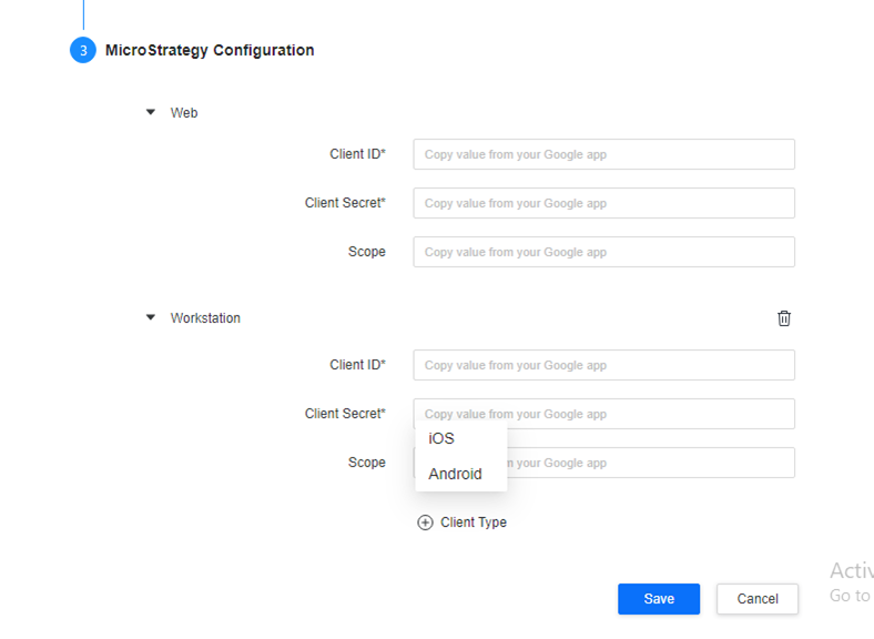 Google BigQuery drivers do not support refresh token authentication modes without a client secret. Therefore, the connection on iOS and Android may fail. You can skip the two clients when configuring Enterprise Security and Strategy will use the client information configured for Web to retrieve the refresh token to connect.