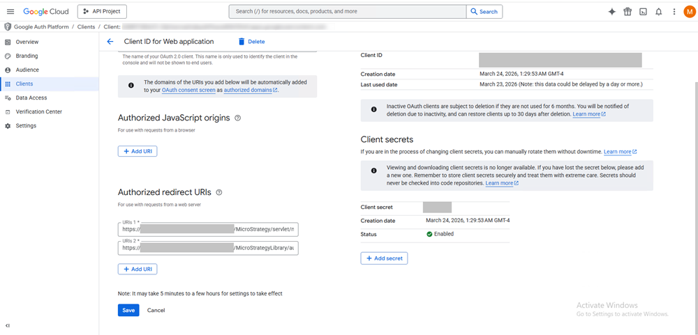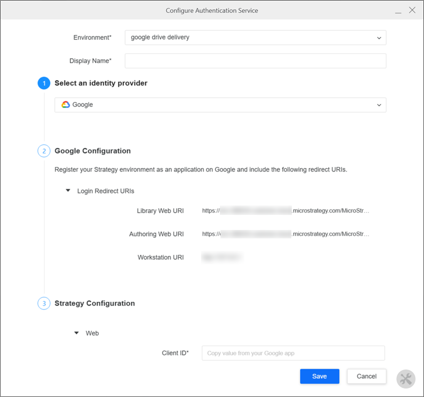 In Strategy Configuration, enter the Client ID and Client Secret you copied in Create an OAuth Application in Google.\
