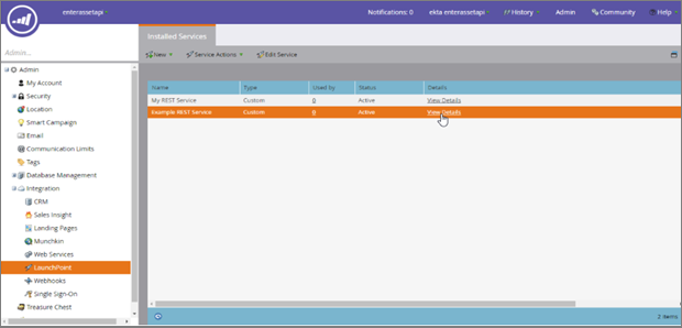 Marketo's REST APIs are authenticated with two-legged OAuth 2.0. Client IDs and Client Secrets are provided by user defined custom services.