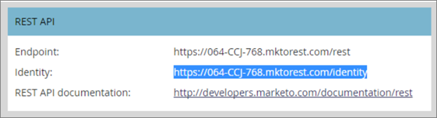 1. Navigate to Admin > Web Services > REST API in your Marketo account and copy the Identity URL.