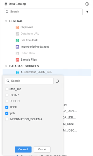 6. In Data Catalog, click the Snowflake data source you created, choose a namespace, and click Connect.