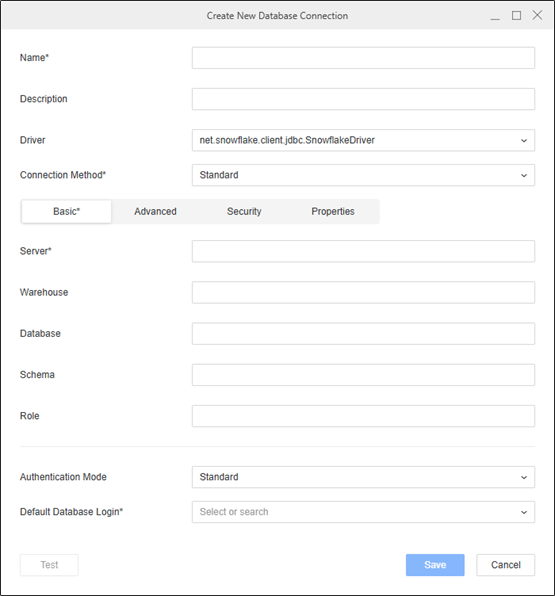 11. Optionally type a Warehouse, Database, Schema, and Role.