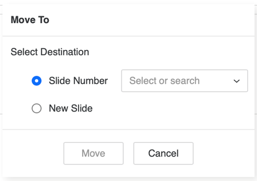 - New Slide: A new slide will be created and your object moves to the new slide.