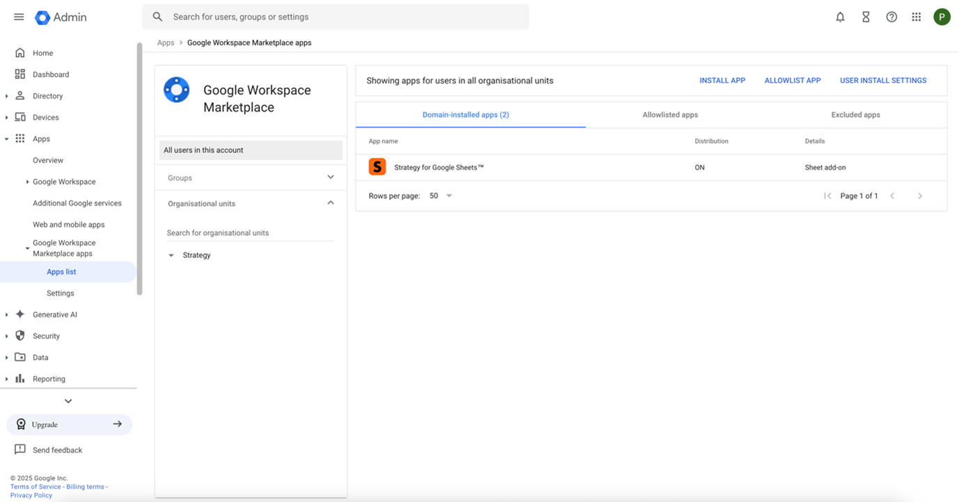 管理者によって無効化されていない限り、管理者とユーザーは Strategy for Google Sheets™ を展開できます。