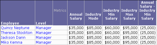 | ▫ | The report displays employees with Employee Current Status Active, Salary - Minimum Salary < 0. |